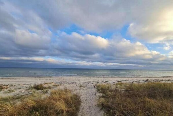 The property features three cozy bedrooms, a fully equipped kitchen, and a comfortable living area, making it perfect for cooking, dining, and unwinding after a day by the sea. Large windows fill the home with natural light, creating a warm and welcoming atmosphere.