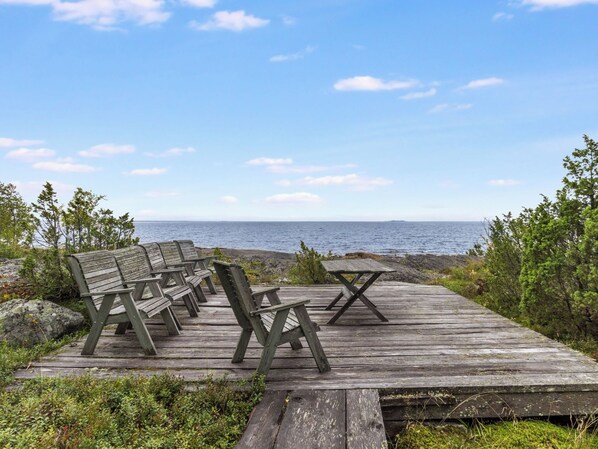 Outdoors, there is a charming grill hut for atmospheric evenings and a storage building available for guests’ use. As a special treat, a traditional smoke sauna with a dressing room can be booked separately — heated on request. The natural rocky shoreline offers beautiful sea views and peaceful sunsets. While there is no pier, the sea is just steps away.