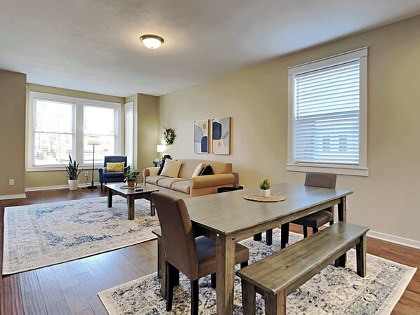 Welcome to the main level unit of our beautiful duplex! This unit has 4 bedrooms, 3 bathrooms, and sleeps 16 guests! Located within walking distance to Butler University with easy access to Interstate 65 and Meridian St, getting where you need to go is a breeze! Whether traveling with family or friends, we are sure our place has everything you need to feel "at home." We would love to host you!
