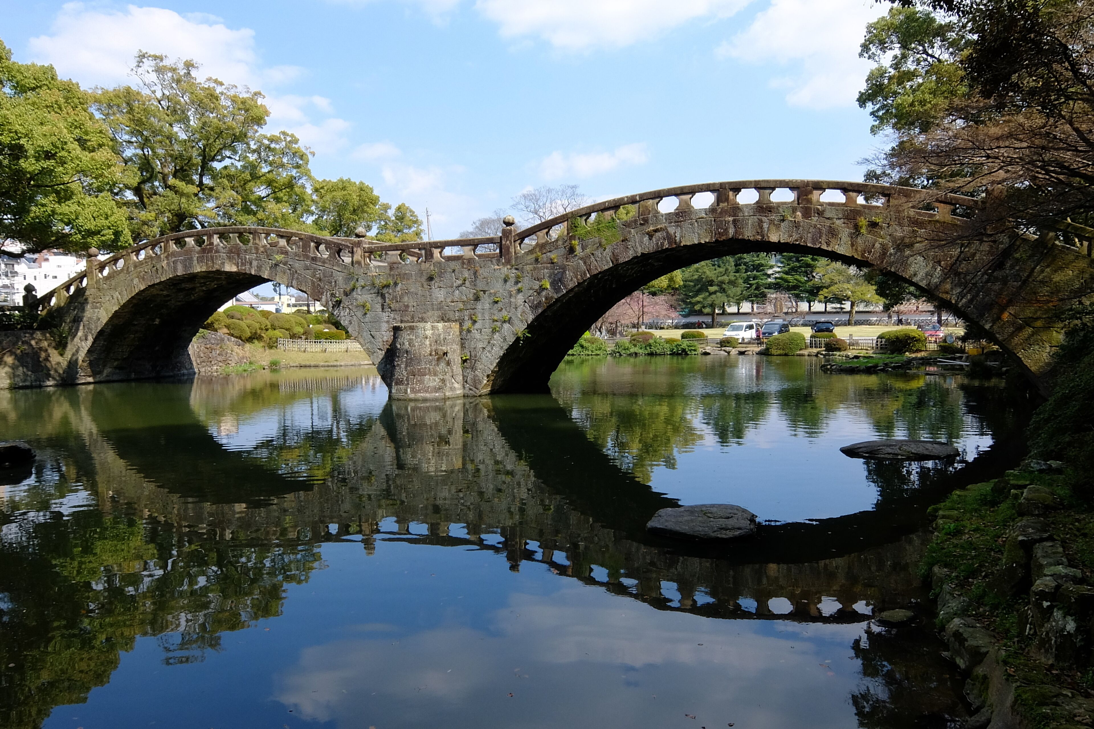 The Megane-bashi of Isahaya Park in Isahaya, Nagasaki prefecture, Japan.
