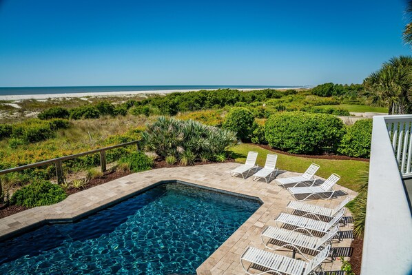 My family just returned from a fabulous stay at this property. The house was absolutely beautiful! It had everything we needed from a very well stocked kitchen to beach chairs and everything in between. The views from the porches and balconies are excellent! We spent quite a bit of time at the pool as well. My only caution would be that the pool would be tricky if you have small children and you are not prepared with floats. The pool bottom is dark which makes it hard to notice that if you go off the steps to the right, you will be in the deep area. The pool is deep in the center. It would not deter me from booking this house, just a word of caution. Overall, we had a wonderful time - everything we could have dreamed of in a beautiful beachfront location!