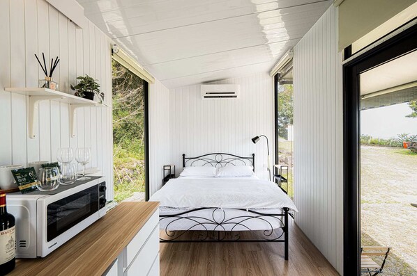 This tiny house “Forest View Cottage 2 ” offers a cozy, nature-integrated retreat with a minimalist design and warm wooden tones. Spanning about 14 square meters, it’s fully equipped with electricity, water, air conditioning, a compact kitchen, cooking tools, and an eco-friendly bathroom with a gas-heated shower.