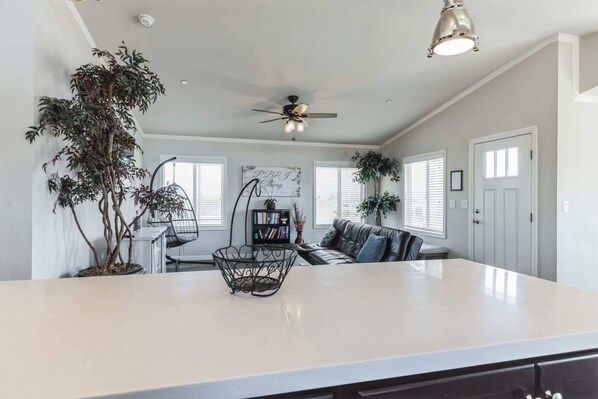 Living Room: The couch converts into a futon, providing extra sleeping options for larger groups.