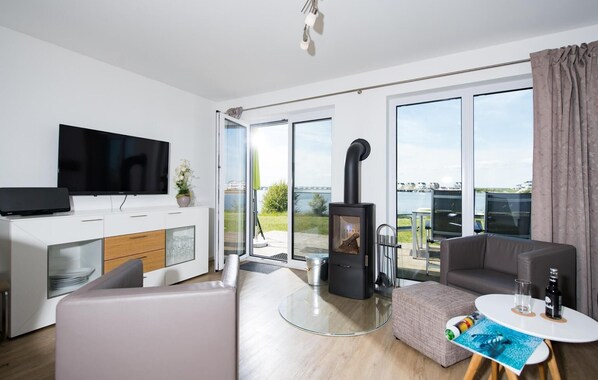 Vardagsrummet och matsalen på bottenvåningen i semesterhuset är översvämmad av ljus och har en angränsande terrass med utsikt över marinan. Oavsett om du solar på solstolen, grillar tillsammans eller läser medan du njuter av hamnbion med förbipasserande segel- och sportbåtar, är den maritima känslan garanterad med Sunshine. Den mysiga sittgruppen inbjuder till en romantisk kväll vid brasan i det nordiska vädret. Brädspel och böcker ger också underhållning i Östersjövädret.