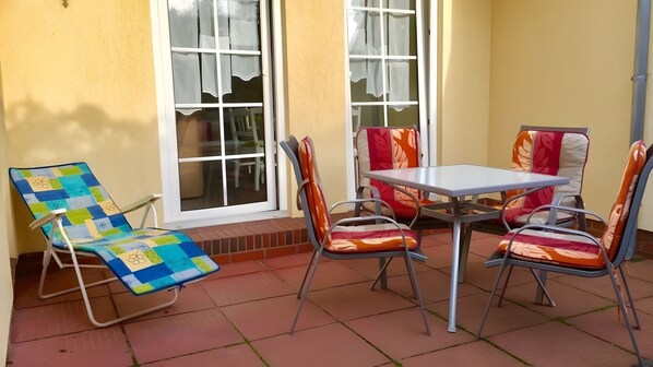 The apartment is located on the ground floor of a renovated holiday complex and is wheelchair accessible. It offers a quiet setting with a private, secluded terrace, a living room with sofa bed and integrated kitchen, a bedroom with a double bed, and a bathroom with shower and window. A parking space is included. The apartment is family-friendly, bicycle-friendly (2 adult bikes and 1 children's bike available), and suitable for workers. There is a sauna inside the apartment.