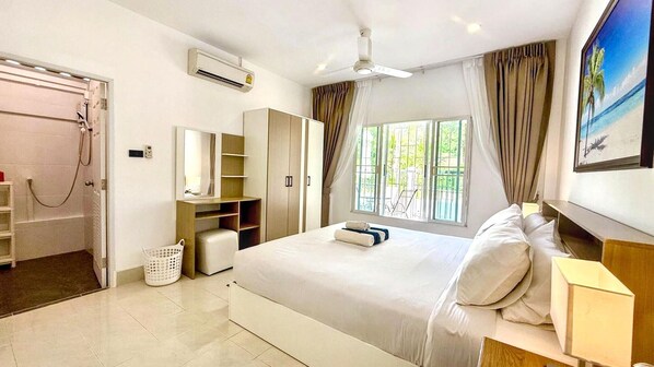 A renovated house with two bedrooms/2baths located near Andaman Phuket Water Park and Kajonkiet International school, not far from Patong Hill/beach or even Phuket city. This house is equipped with 2 King size beds one in each bedroom with 3 air cons plus 4 ceiling fans to cool the house/opened terrace in front of the house with tree to sit to have coffee in the morning/evening. There is also a washer/dryer/hanger. There are new 55" Smart TV/Full Kitchen/utensils. Private WIFI-500/500Mbps.