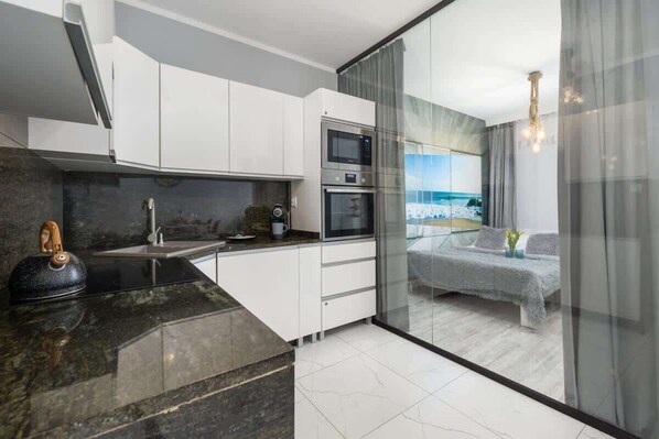This beautiful apartment of 35 m², guarantees comfortable accommodation for 4 people, making it an excellent choice for a seaside vacation for the whole family! The exquisitely decorated apartment consists of a living room with a kitchenette, a bedroom with a double bed and an elegant bathroom with a shower. The living area features a comfortable sofa for relaxing and a dining table with chairs to accommodate the whole family. The apartment comes with a private balcony with garden furniture, which is the perfect place to relax after a day full of activities. The space of the property is conveniently designed, meeting all the needs of guests. The carefully finished interior of the apartment impresses with style and design. The apartment has a perfect, modern atmosphere straight from the best hotels. Comprehensive kitchen equipment (dishwasher, microwave oven), bathroom equipment (washing machine, hair dryer) and multimedia, i.e. high-speed wi-fi connection and TV with Smart technology and terrestrial channels guarantee the highest comfort of stay. The apartment is equipped with all the basics necessary for relaxation. A complimentary set of toiletries (soap, shampoo and shower gel), towels and linens are provided for a successful start to each stay. The property comes with a private parking space in an outdoor parking lot.