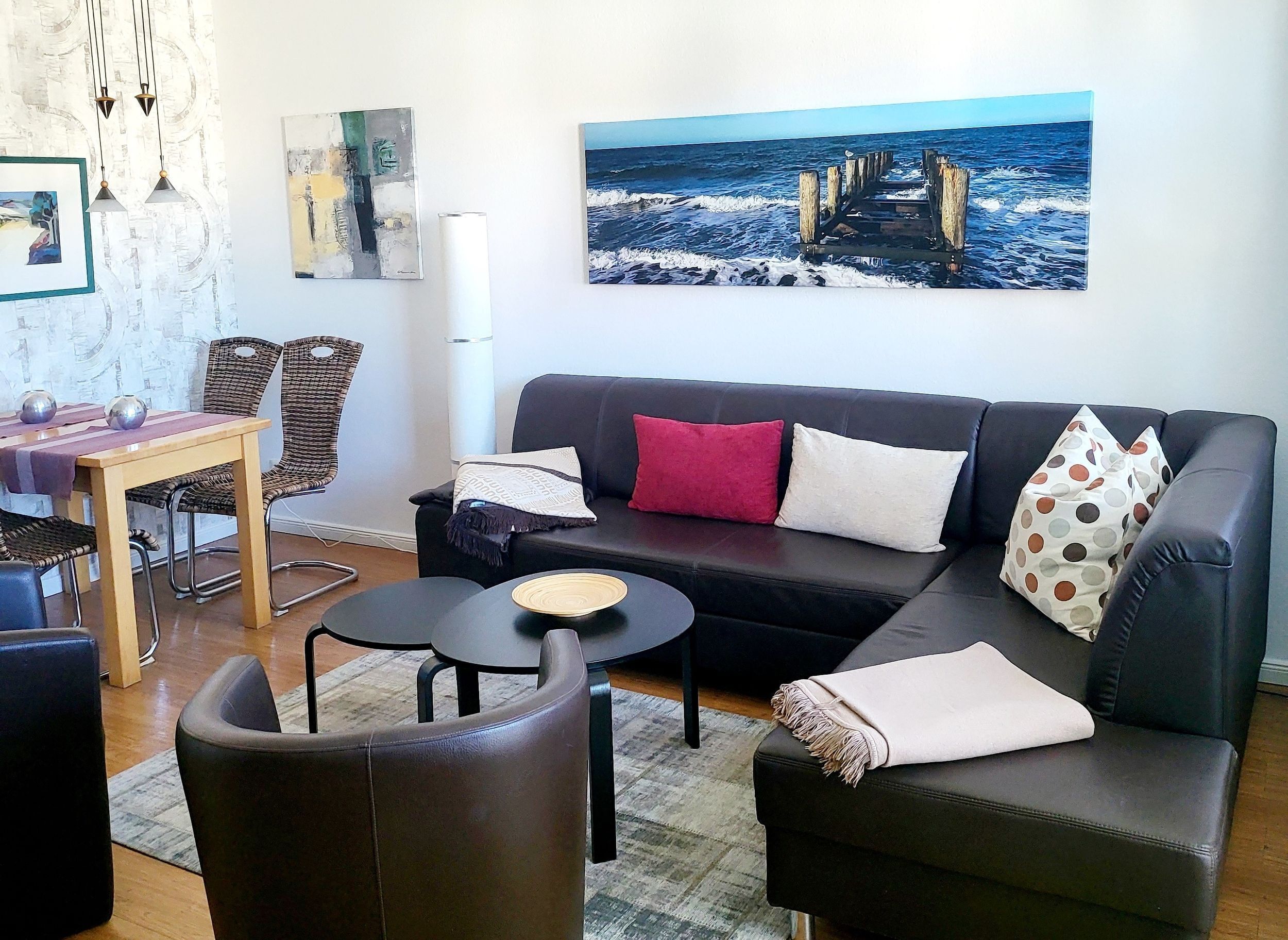 Bara 150 m från stranden bor du i en 2-rums-lägenhet. Lägenheten på 50 kvm är den 1: a Golv. Vardagsrummet är möblerat med en soffa, soffbord, fåtölj, skänk, med kabel-TV, radio, matplats (bord och stolar) och pentry. Balkongen med bord och stolar går till östra sidan. Sovrummet har en dubbelsäng och en garderob. Pentryet var utrustat med mikrovågsugn, kylskåp, kaffebryggare, keramikhäll och ugn, diskmaskin, brödrost och vattenkokare. Badrummet med dusch och toalett slutför lägenheten.