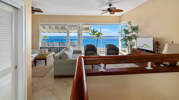 • Master Bedroom Suite Loft – ocean view, upper level via spiral staircase, AC, king bed, flat screen TV, access to private ocean view seating lanai, full bath, walk-in shower
