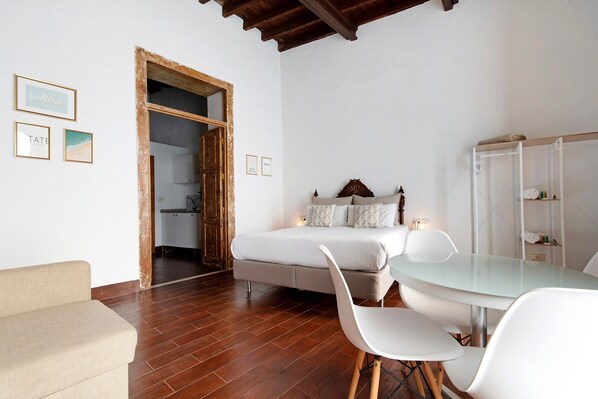 Don Pepe Apartment at Casa San Marcial offers 40 m² and accommodates up to 2 guests. Located on the ground floor, it features 1 bedroom with a queen-size bed and a sofa bed, a private bathroom, and a private kitchen equipped with basic utensils, a microwave, and an induction hob for your convenience. Other private amenities include Wi-Fi, an electric coffee maker, TV, and a fan for added comfort.