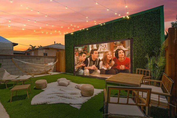 Your private backyard transforms into an open-air cinema — projector, string lights, and floor cushions for movie nights under the stars.