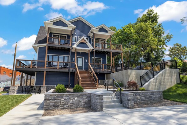 Features of the home's exterior include: - Hot tub with towels available - Fire Table and outdoor seating area overlooking the downtown skyline - Back patio with dining area, umbrella, and string lights creating the perfect ambiance as you admire the downtown views - Grill - Luscious backyard grass area - Wrap around front porch with rockers and amazing downtown views - Front patio area that overlooks and has steps directly to Mellwood Arts Center, with seating and cornhole game - Wrap around top floor balcony off loft area with seating and amazing views - Balcony off primary bedroom to enjoy your coffee and views - Balconies & back patio are ideal viewing locations for any fireworks and drone shows that are happening in downtown Louisville. This would include THUNDER OVER LOUISVILLE, 4th of July celebrations, or any post- game Louisville Bats minor league baseball, Louisville FC soccer, and Racing Louisville soccer (Review their schedules for firework/drone post game events) - Ample photo opportunities downtown Louisville - Peaceful courtyard with beautiful landscaping and seating - Amazing site lighting for when the sun goes down (be sure to check out the photos!) - Approximately 70 foot long driveway that can accommodate 5 to 8 vehicles, as well as free on street parking