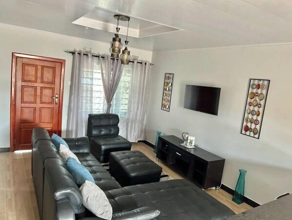 If you are looking for a quiet place to unwind look no further, this semi- detached two bedrooms apartment is located close to the Bonaventure Makeni area not too far from the Makeni and Cosmopolitan shopping malls. Enjoy the beautiful private view of gardens with a separate driveway and automatic gate. This brand new, modern self catering apartment comes fully furnished with a functional kitchen, air conditioning, Wi-Fi, a smart TV, washing machine, pressing iron and microwave.