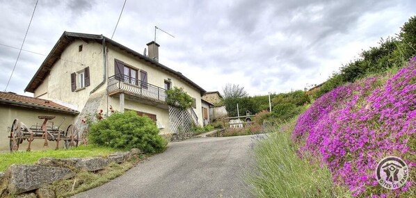 In the cherries area (Lyonnais region) self-contained gite adjoining owners' home. Ground floor: garage. 1st floor: kitchen, living room, alcove with lounge area, loan of mobile phone (deposit required). 3 bedrooms (double room, 2 connecting twin-bedded rooms). Bathroom, WC. Outdoors: balcony with views of the Coteaux du Lyonnais countryside (fruit trees are very picturesque in spring time), small unclosed & sloping garden, paved area (football table) to front. Small enclosed terrace shaded by wisteria at the back (direct access from living room). Tasting during the cherry season. Charge for pet : 6€/day/pet. In the cherries area (Lyonnais region) self-contained gite adjoining owners' home. Ground floor: garage. 1st floor: kitchen, living room, alcove with lounge area, loan of mobile phone (deposit required). 3 bedrooms (double room, 2 connecting twin-bedded rooms). Bathroom, WC. Outdoors: balcony with views of the Coteaux du Lyonnais countryside (fruit trees are very picturesque in spring time), small unclosed & sloping garden, paved area (football table) to front. Small enclosed terrace shaded by wisteria at the back (direct access from living room). Tasting during the cherry season. Charge for pet : 6€/day/pet.