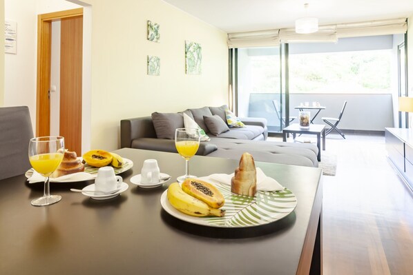 Det mysiga vardagsrummet har en stor soffa, två förrådsmöbler med TV och gratis internet, en matplats. Lägenheten är utrustad med gardiner som gör att du kan sätta upp ljuset och stora glasfönster som kan glida för att öppna bredvid vardagsrummet på verandan för soliga luncher (utomhusbord och stolar).