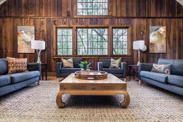 3 bedrooms, 2.5 bathrooms, with 2 stone fireplaces and large glass windows. There is a spacious backyard with a fire pit and breathtaking wooded walking trails to a nearby historic Grotto. This Lodge is perfect for romantic couples and families with small children.