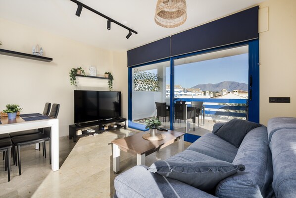 The holiday apartment "El Hacho" is located in Manilva and boasts a beautiful view of the Mediterranean Sea. The 60 m² property consists of a living room with a sofa bed for 2 people, a well-equipped kitchen, 1 bedroom, and 1 bathroom, and can accommodate 4 people. Among the on-site amenities are high-speed Wi-Fi (suitable for video calls), a smart TV with streaming services, air conditioning, a dishwasher, and a washing machine. A travel baby cot and a high chair can also be provided.