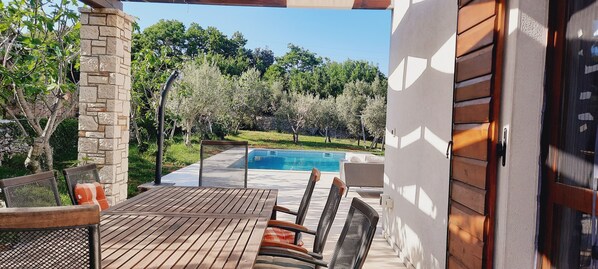 Rustikt fritidshus Villa Ulika i 2 våningar, byggd 2012 på orten, med bubbelpool, lugnt, soligt läge, 2 km från havet. Huset passar för upp till 8 personer, perfekt för familjer. Huset ligger i ett vackert naturområde, oberoende och stängt. Parktplaetz hemma i motivering. Det är idealiskt för en vistelse i en autentisk miljö för alla som vill uppleva landsbygdslivet utan att offra den vanliga komforten. Om du kom till hösten uppmanas du hjärtligt att hjälpa till med druvskörden eller olivplockningen. Husets inre: 3-rums-hus, 160 m2 med 2 våningar, rustikt, smakfullt och mysigt inredd: vardagsrum 40m2 med satellit-TV och luftkonditionering, internet, utgång till terrassen. Öppet kök (4 kokplattor, ugn, frys, diskmaskin). Dusch / wc. Övre våning: 1 rum med 1 dubbelsäng (180 cm, längd 200 cm), 1 rum med 1 dubbelsäng (160 cm X200 cm) och 1 rum med dubbelsäng (160 cm, längd 200 cm) 1 badrum