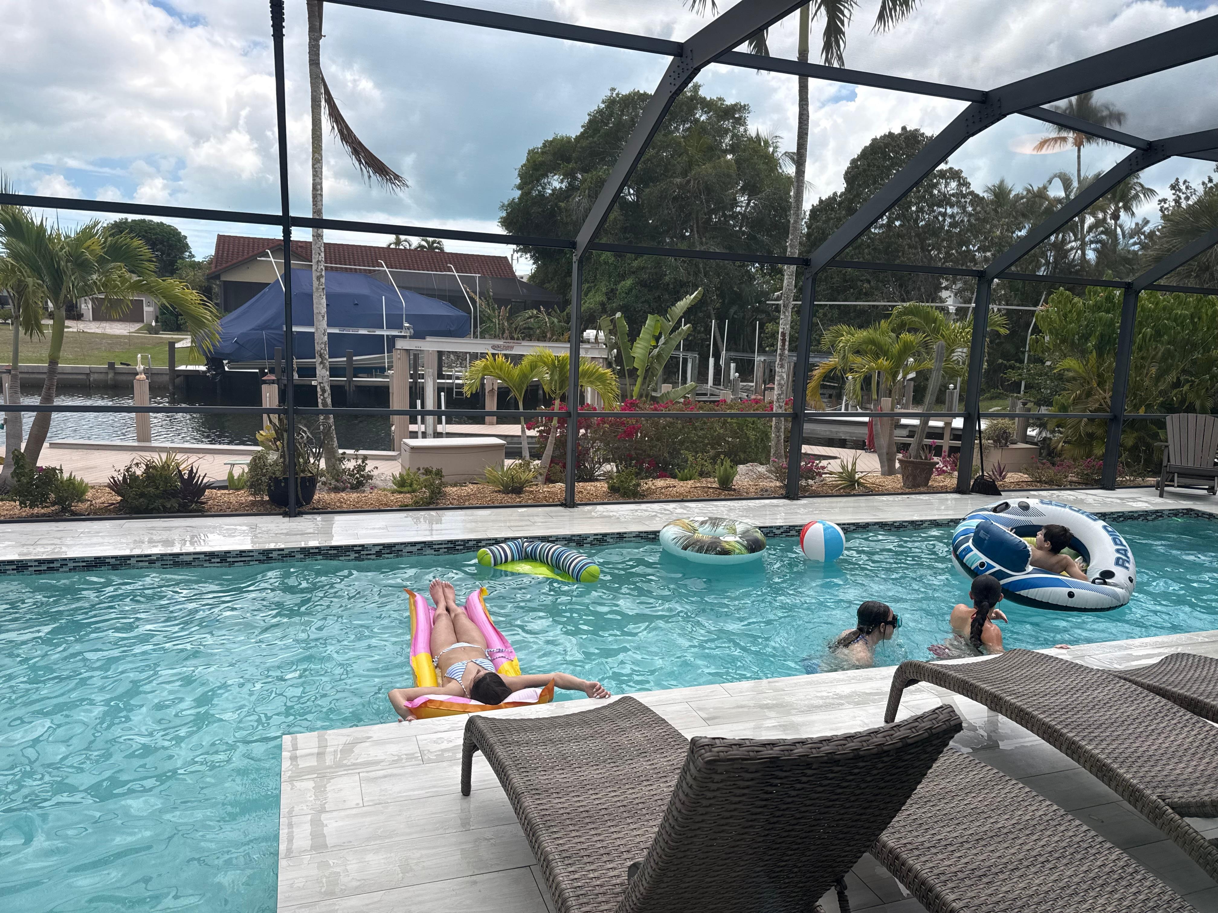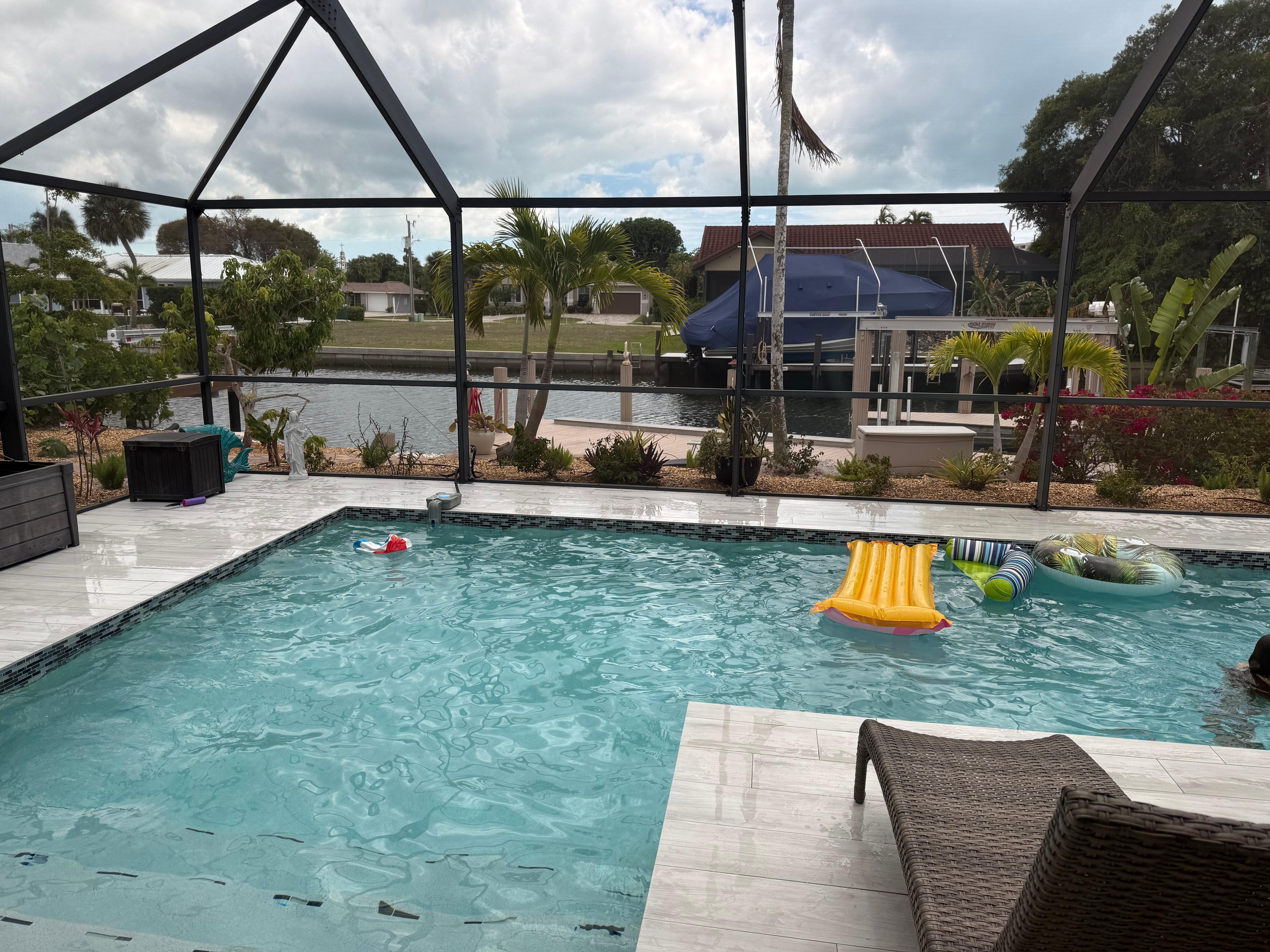 Beautiful modern single-family home located just 0.4 miles from popular Resident's Beach. This home is in a prime location of sunny Marco Island featuring the most-wanted southern exposure. Including a large dock to fish off or to simply take in the view, this home is perfect for a relaxing day. You can enjoy a screened in lanai with a spacious pool or walk to nearby restaurant's as well! Two bedrooms and two bathrooms with a pull out sofa, this home will nicely accommodate up to 6 people. Updated kitchen with granite counters and stainless appliances. Power blinds on the sliders if wanting some privacy. Flat screen tvs offered in both the living room and master bedroom.