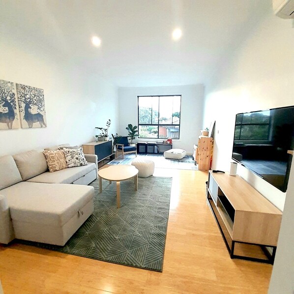The living space is the perfect spot for relaxation. A HD-TV, equipped with Netflix, is mounted opposite the sofa. The sofa can be extended into a sofa bed. Next to the sofa, is a space for kids to play. A mini kitchen is full of fun toys to play with. The bookshelf is filled with books for young children.