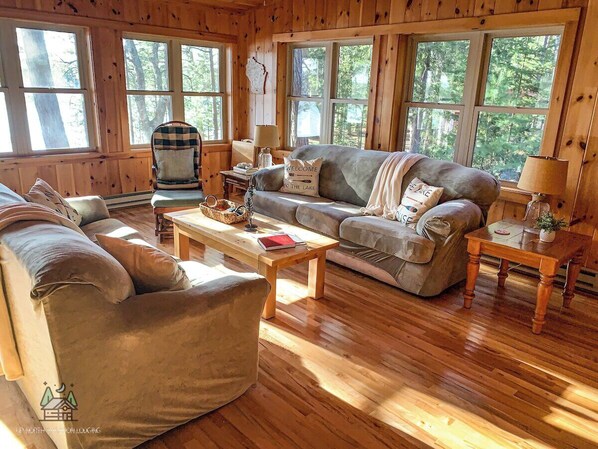 The large 18 x 25 main room is finished with knotty pine, maple floors and wall-to-wall windows so you can enjoy the sights and sounds of Echo Lake and of course, those amazing sunsets and loon calls. The cottage style kitchen is fully furnished with all your cooking needs. The primary bedroom has a queen bed and a sink. The second bedroom has a full-size double bunk bed. Both bedrooms have gel memory foam medium firm mattresses for cool sleep and pressure relief. The beds include microfiber lightweight sheets with comforters and blankets. Included are several pillows with variable firmness. Both the mattresses and pillows are encased in protective covers. We focus on cleanliness and comfort.