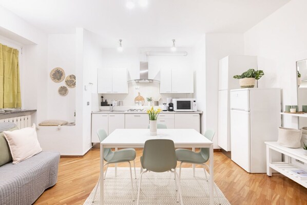 Upon entry, the apartment welcomes you with a modern and bright open space area, which includes a linear kitchen fully equipped with latest-generation appliances, perfect for those who love to cook and experience the home environment in a practical and efficient way. The adjacent dining area is designed to host pleasant moments of conviviality, while the living area, with a comfortable sofa and TV, is ideal for daily relaxation, whether watching a film or reading a book.