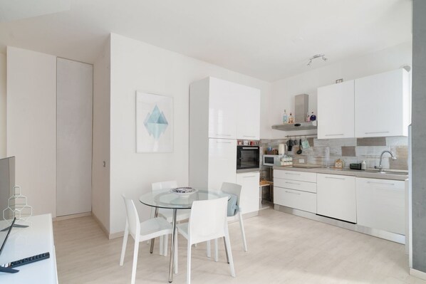 - KITCHENETTE with induction hob, oven, microwave, refrigerator, freezer, dishwasher, kettle, moka pot, wine glasses, and kitchen utensils;