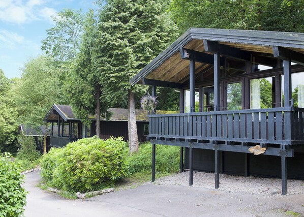Spacious lodge with one king-size double with en suite shower, one twin and one twin. Bath with overhead shower. Open plan lounge/kitchen/dining area leading onto balcony. Dishwasher. Outdoor hot tub. Pets in specific lodges only.