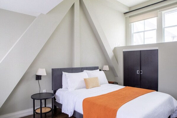 The space comfortably sleeps two with a queen bed and has flexible seating areas so you can work or relax at your convenience. The living room loveseat is relatively small (while lying down, most people would have legs hanging off the end) so we`ve excluded it as a sleeping area. You are welcome to add a 3rd guest, however please keep this info in mind.