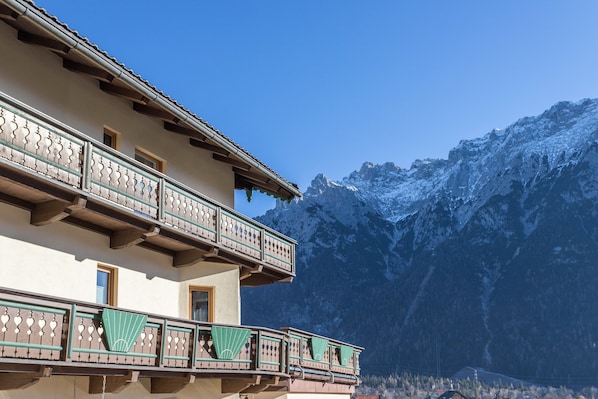 Your private outdoor area includes garden furniture, an open terrace and a balcony, that offers a wonderful view of the Karwendel mountains..