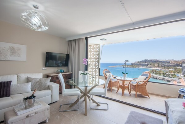 Denna lägenhet är en lyxig svit med balkong direkt på stranden på 11: e våningen, totalrenoverad med mycket höga krav. Med en enastående utsikt över havet och poolen från hela stället sitter den på en av de bästa stränderna på ön. En livräddare är på plats för din säkerhet. Området är känt för det bästa klimatet på Gran Canaria och även i världen. Det är paradis för strandälskare, vandrare och cyklister.