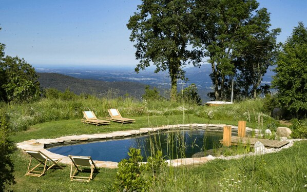 With breathtaking views of the Tech Valley and the Mediterranean, the organic swimming pond, fed by the Mas's historic spring, the wood-heated Nordic bath, and the panoramic sauna offer an idyllic setting for relaxing and connecting deeply with nature.