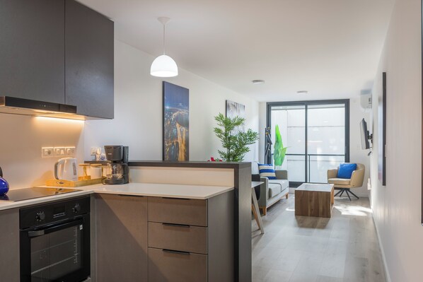 Inside the Condo Brio entry, a great room to the right features a stylish sofa, swivel chair, and wall-mounted Samsung Smart TV. The dining table comfortably seats four, the breakfast bar has two barstools, and the modern kitchen is fully equipped. A large sliding glass door leads to a small balcony.