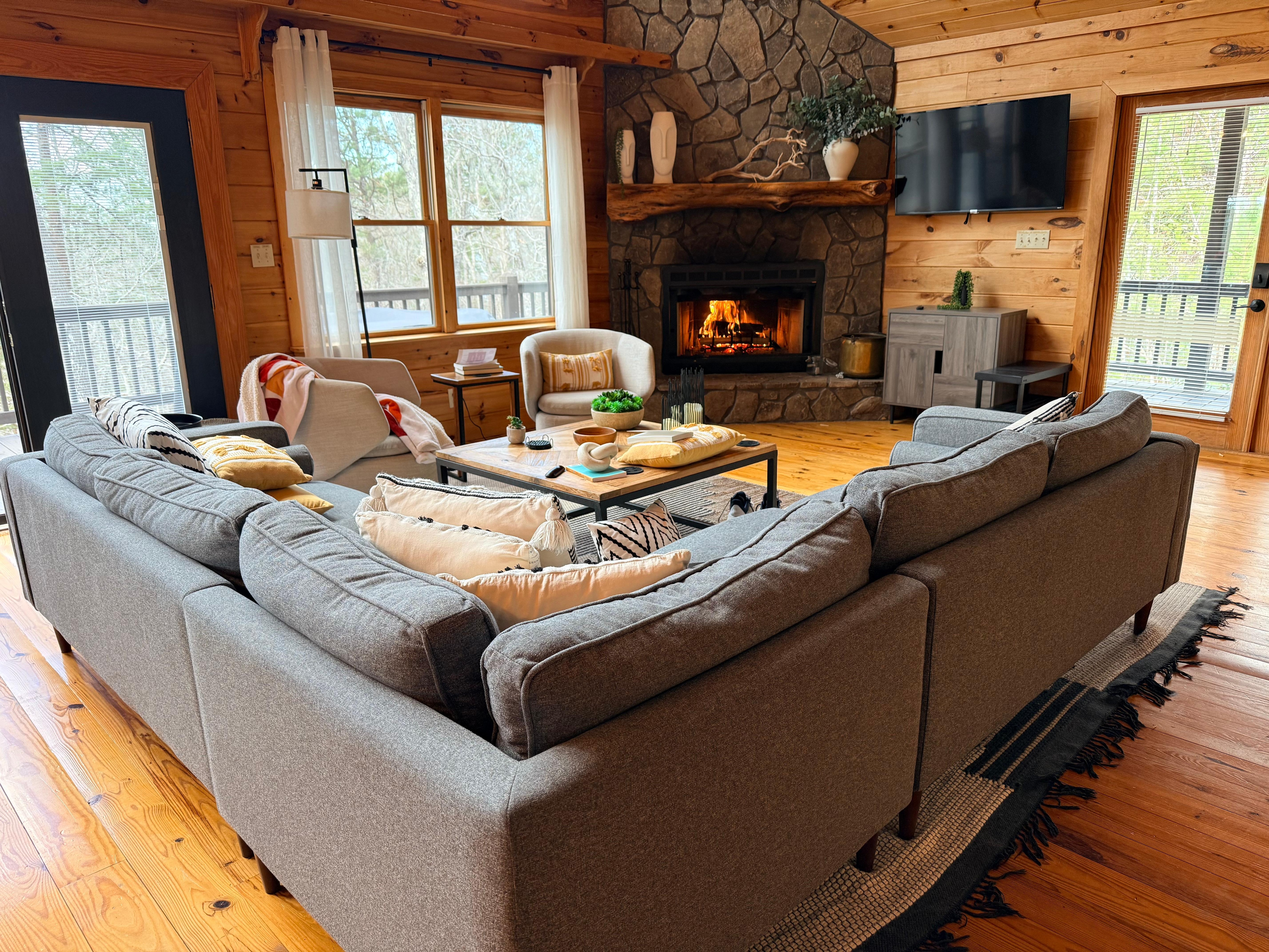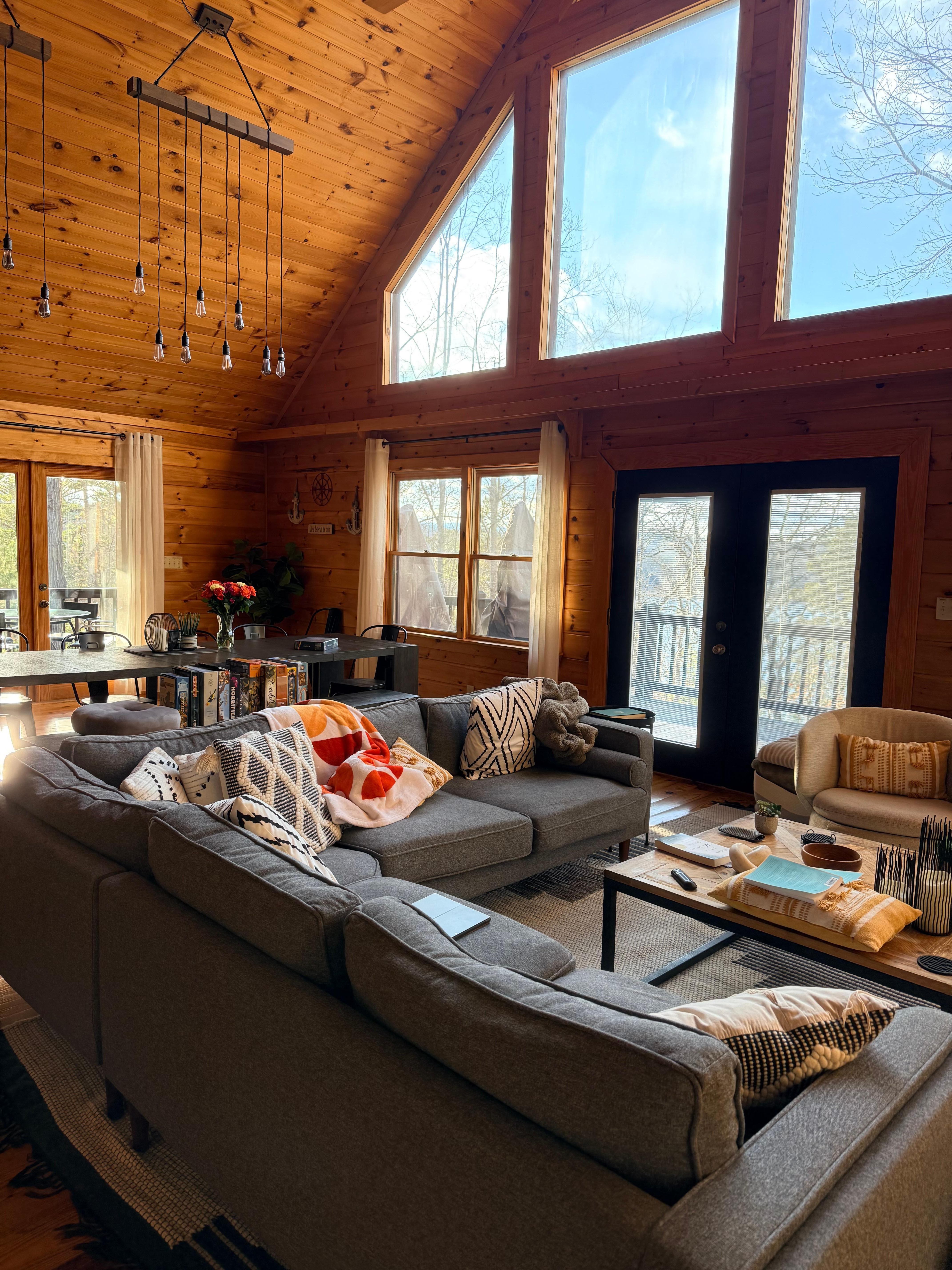 Step into a spacious cabin blending rustic charm with modern comfort, featuring panoramic lake views and premium amenities.