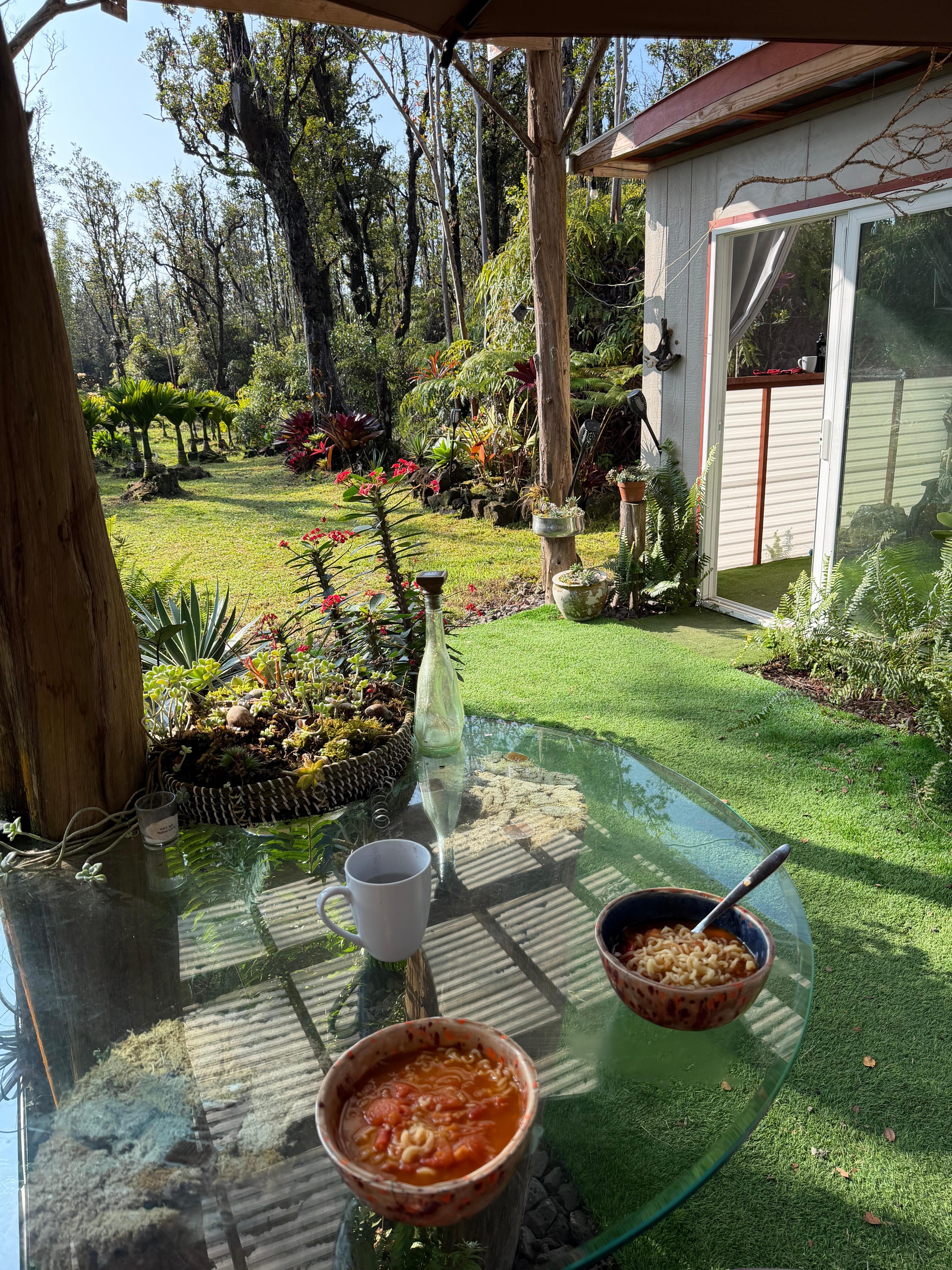 After a day at Volcano National Park-we had the privilege of staying in this amazing garden oasis! We easily found the property (during the daylight) and settled in. Left for dinner at Dimple Cheek and returned at dusk. The garden became even more beautiful! You can see the love and care the owners have poured into this garden! The nighttime sounds and solar string lights made this unique experience even better! If you’re looking for something different and above the ordinary- we highly recommend you choose this location!! We hope to return!