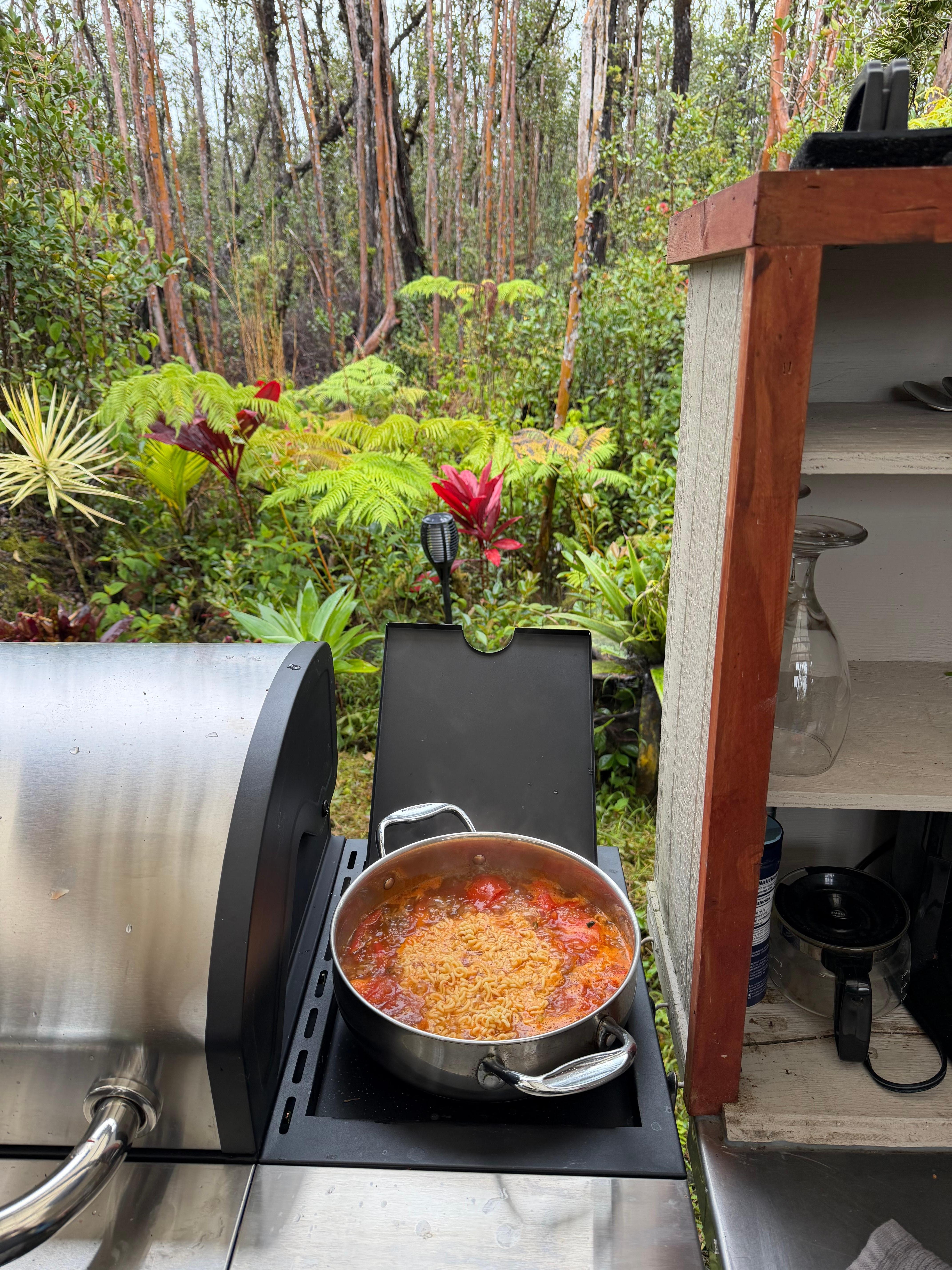 While our cabin is rustic, we have ensured that all modern creature comforts are provided. Unplug and enjoy the ultimate luxury of life - beautiful nature, with your loved one by your side. Our one-of-a-kind outdoor rain shower is created with a hundreds-year-old Ohia log and large, smooth lava pebble stones, surrounded by all kinds of succulents and tropical plants.