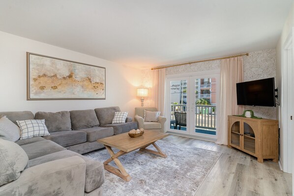 This Murrells Inlet condo boasts 3 bedrooms with a king, queen, and 2 full beds. This spacious 1st floor condo (up one small flight of stairs) has a balcony overlooking the pool.