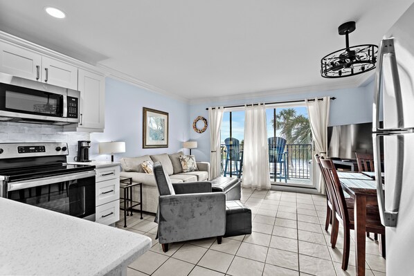 Step into a bright and inviting living space featuring coastal-inspired décor, comfortable seating, and a flat-screen TV, creating an ideal spot to relax after a day by the shore. The fully equipped kitchen, complete with modern appliances, makes it easy to prepare your favorite meals and snacks.