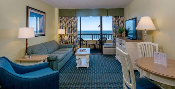 Our Oceanfront Suite consists of two Queen beds in the bedroom, a separate living room with a sleeper sofa and full size wall bed, a full kitchen equipped with your basic cookware and dinnerware, two televisions, wireless internet access, one bath, and a private balcony that overlooks the ocean. This unit sleeps up to 6 guests.