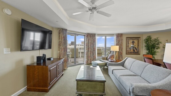 This ocean view 2 BED / 2 BATH condo on the 16th floor of Royale Palms Resort is located next to Hilton Myrtle Beach. It has beautiful views of the resort and ocean that can be enjoyed from a large private balcony easily accessed from both bedrooms and living room. Spend time and enjoy lounging outside while sipping on something cold or hot; entertain your family and friends, and of course, you're always invited to use the owners' fenced-in private pool area for a more secluded relaxation.
