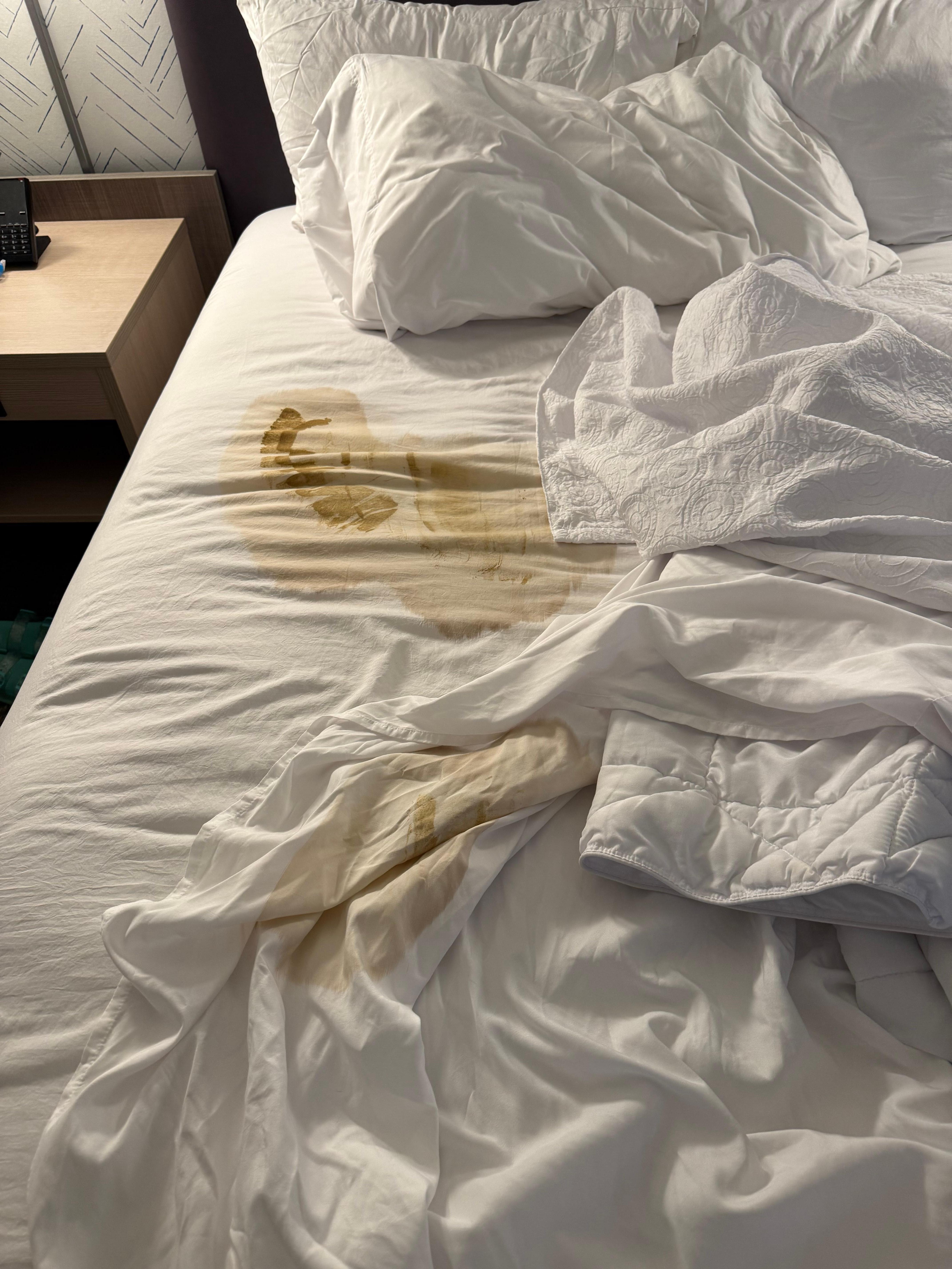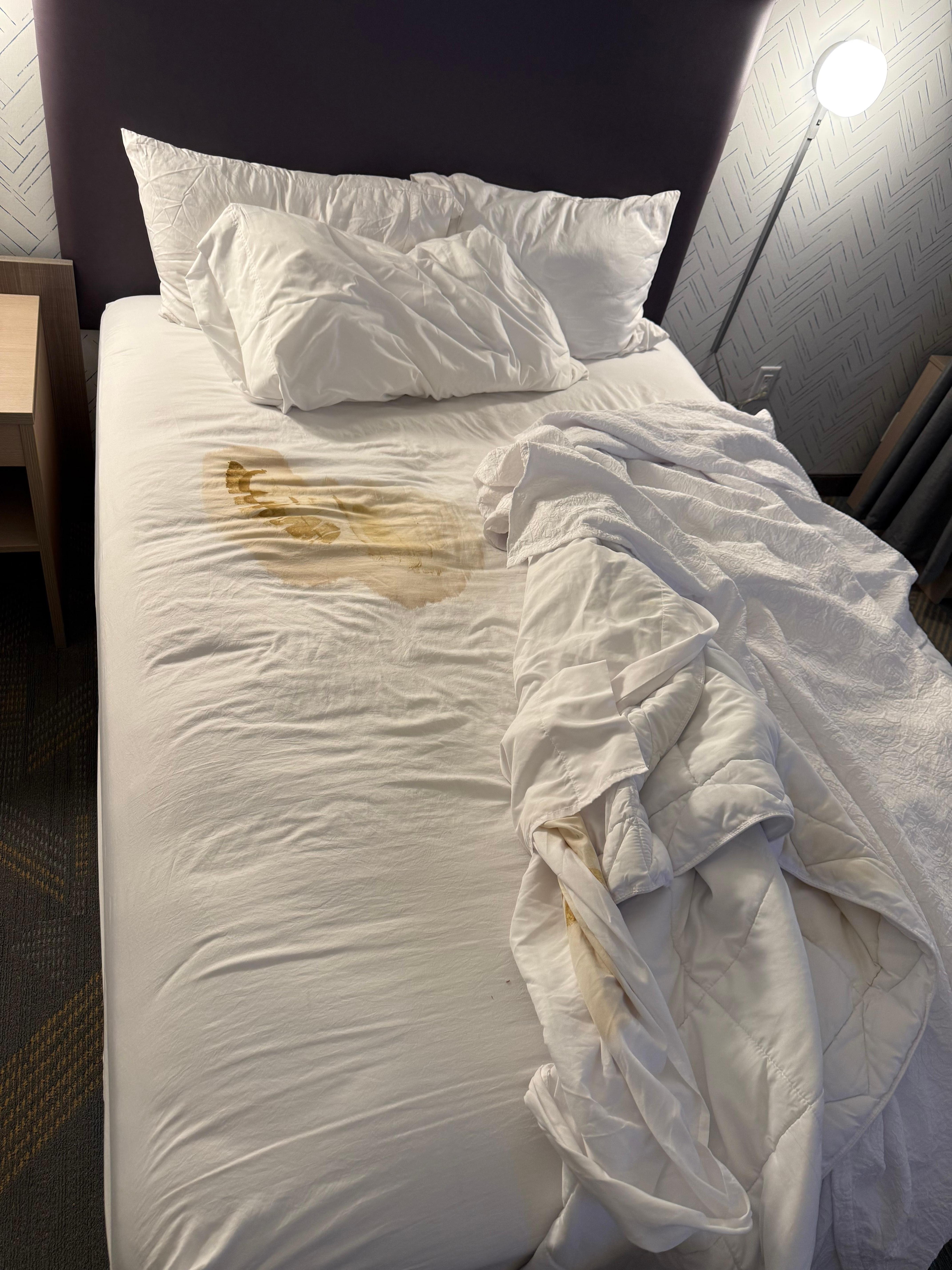When we arrived on 4/3/26, the bed in our room had visible feces/stains on it. This is not a minor issue — it is a serious sanitation failure and completely unacceptable for any hotel, especially one under a major brand.