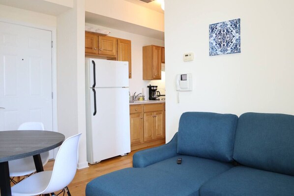 Alla gästrum hos 1BR Apartment - Free Parking - Self Check-In ståtar med förmåner som luftkonditionering, samt extra bekvämligheter såsom matbord och wi-fi.