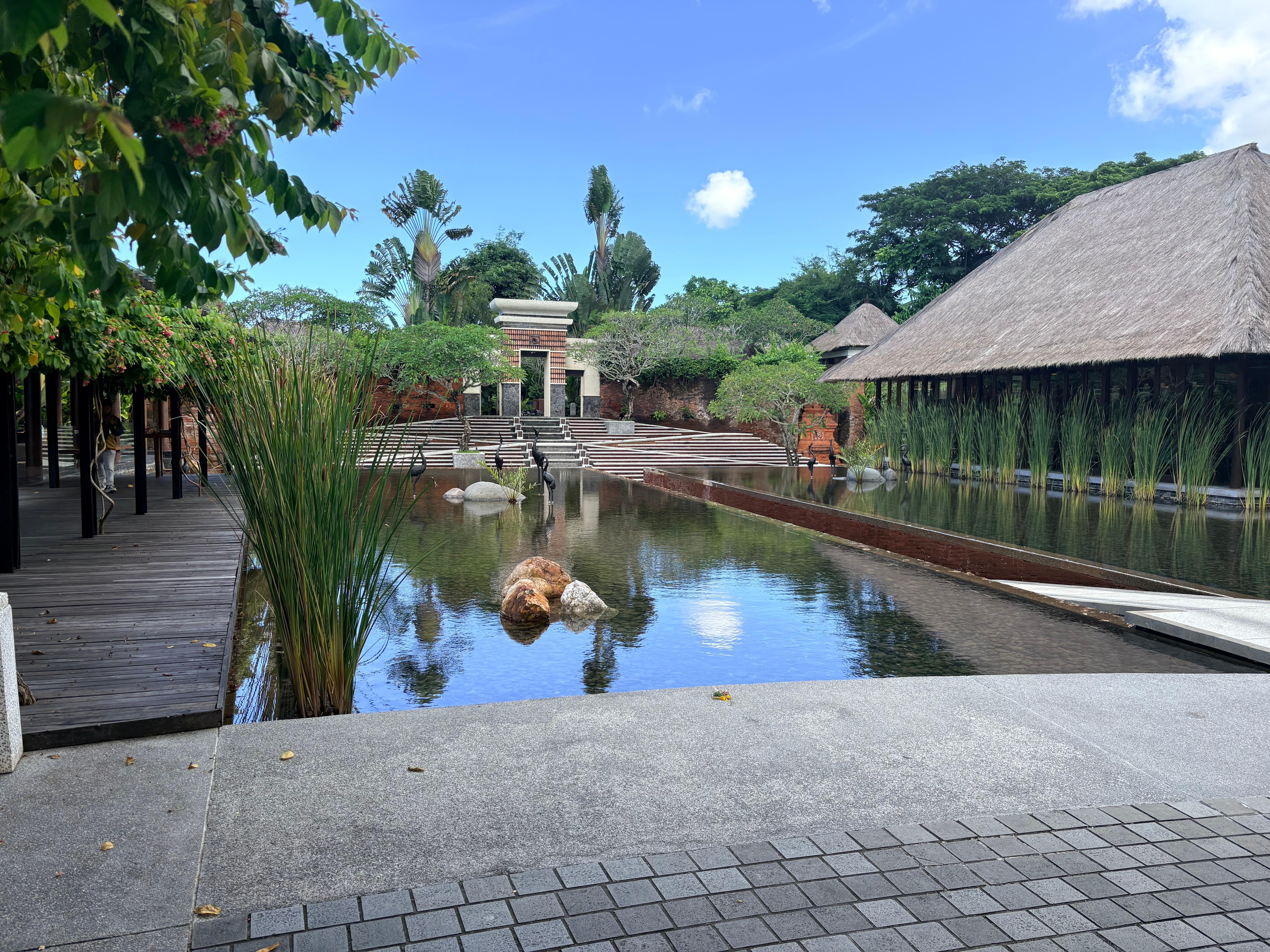 The hotel is very buitifull many trees and buitiful plants, water flowing along the walking path.