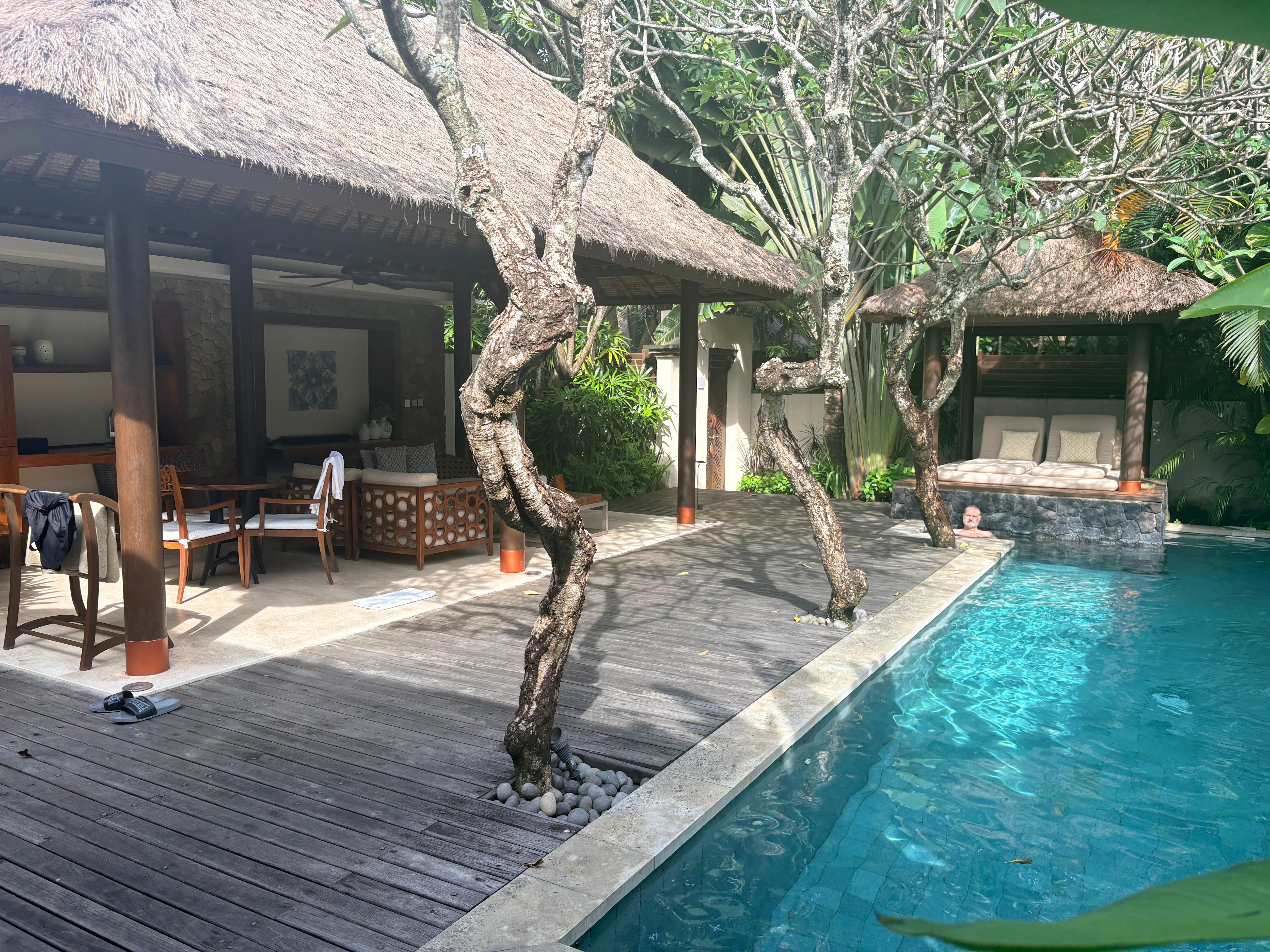 This is a absolutely beautiful property with phenomenally stylish and serene villas, lovely grounds, and serving a fantastic breakfast. We did a complementary yoga class one morning of our stay and it was wonderful. The room came with a complementary bottle of wine (a Rose from Bali that was surprisingly pleasing) plus other complementary snacks, drinks, and a well stocked coffee service. The villa was immaculately clean and well designed. The pool in the two bedroom villa was almost long enough to do a serious lap swim workout in. The beach is a 10 minute walk and there is a shuttle every hour. The property is also a 5 minute walk from a large but tasteful shopping area. This was a splurge for our family but absolutely worth the price for the outstanding quality of the villa and the entire experience.