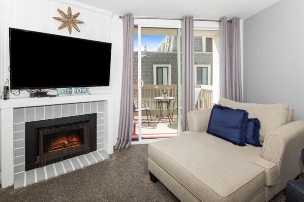 G305 is furnished to comfortably house 4 with a a queen-size sofa bed and comfortable oversized chair. The living room also has a 60-inch flat-screen TV with a Blu-Ray/DVD player that you can also use to watch the cable TV with 250+ channels. High-speed cable internet is also included free of charge. For the occasional cool winter day - or to create an ambiance - the living room has a gas fireplace that is fully functional for your enjoyment.