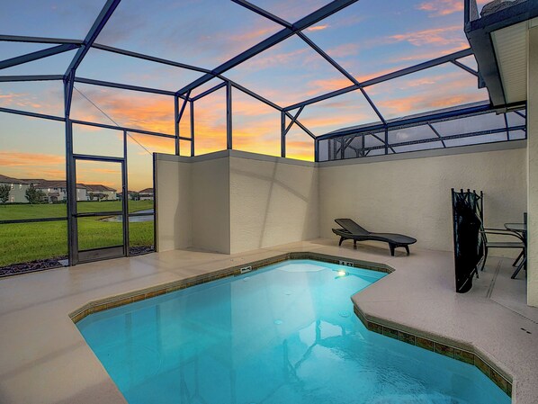 Outdoors: Private screened pool with seating.