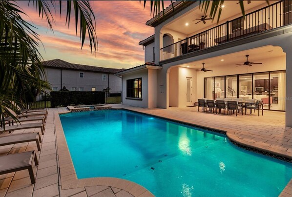 Gå in mot poolområdet genom skjutdörrarna för att njuta av Florida-solen under hela semestern. Den täckta Lanai har ett sommarkök med naturgasgrill, minikylskåp, handfat, bänkskivor i granit, 32-tums TV, surroundljud fr��n vardagsrum och lyxiga utemöbler. Den privata poolen har en solhylla perfekt för de små, spillover spa för avkoppling och utsikt över bevarandeområdet. Det finns också en pool halv badrum ligger på den täckta Lanai.