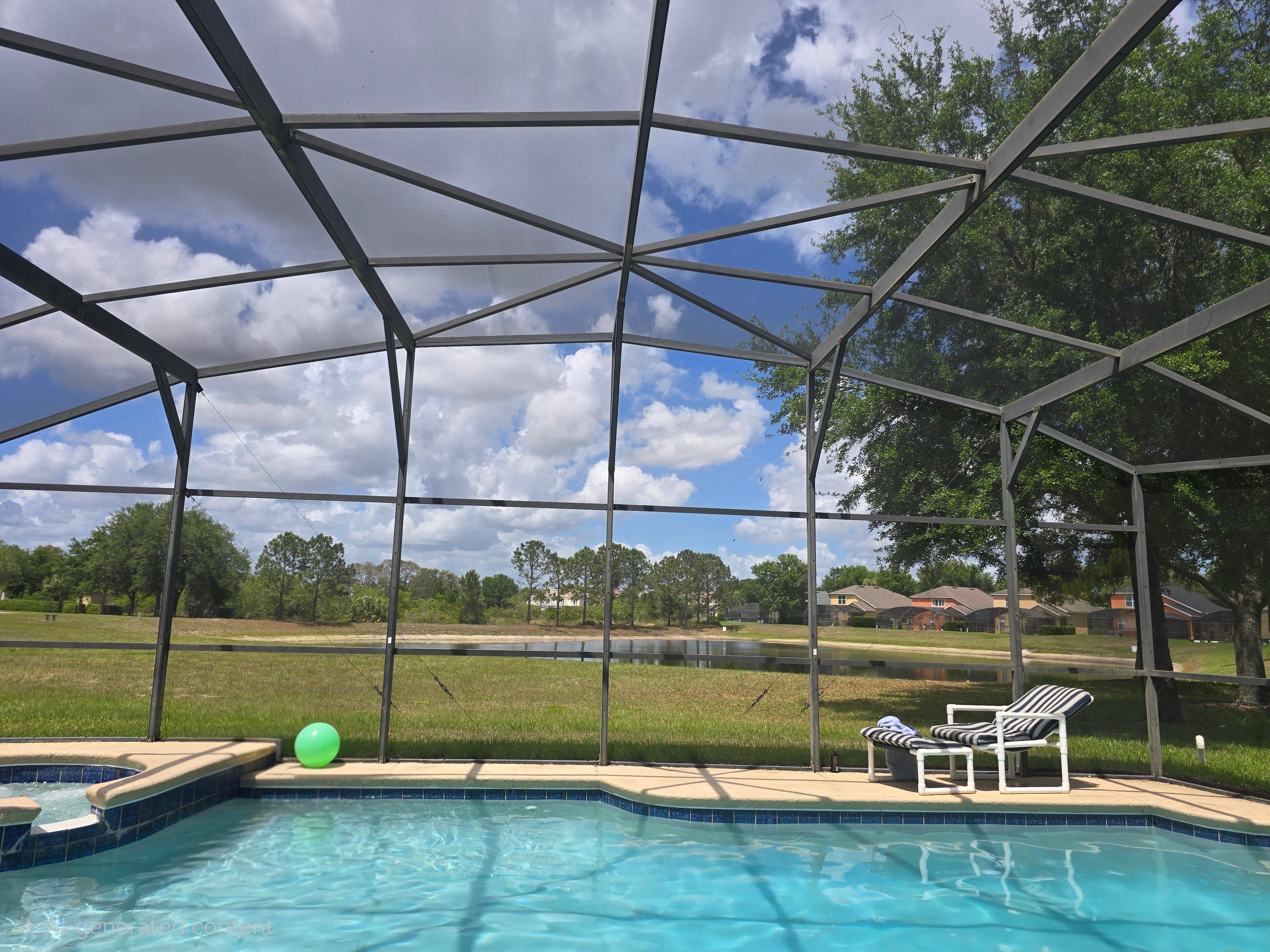 Vår villa gör att du kan koppla av runt poolen och spa-däcket, där du kan njuta av en kall förfriskning medan du tittar på den majestätiska solnedgången i Florida med vårt söderläge pooldäcket. Också från pooldäcket har du en fin utsikt över sjön utan grannar på västra sidan av huset. För dem som har små barn finns en lekplats på västra sidan av huset med direkt tillgång från den skärmade i pooldäcket. Det är ett vackert grönt utrymme att njuta av.