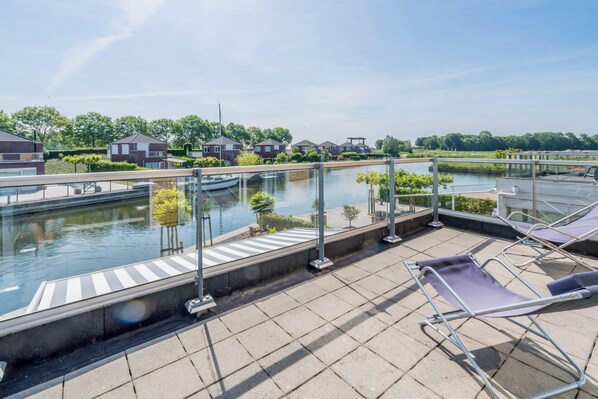 Beautiful holiday home with various extras such as an extended bedroom on the ground floor, veranda including awning and several storage rooms. Slaak 96 is suitable for 6 people and includes 3 bedrooms, 1 bathroom, separate toilet and a kitchen with a 4-burner gas stove, combination microwave, refrigerator, Senseo coffee machine, dishwasher, kettle and freezer with 3 drawers. The bright living room has a cozy sitting area, dining area and TV (smart TV). The bathroom has a shower, sink and toilet. The bedrooms are divided as follows: 1 bedroom on the ground floor with a double bed, 1 bedroom on the first floor with a double bed and 1 bedroom on the first floor with a trundle bed. Bed making service can be booked! From the garden you have a view of the water. A garden shed, roof terrace, parking on site, parking space for trailer next to the house, 12 meter mooring width, ironing board and iron, washing machine, sun loungers, garden table with chairs, swimming ladder and decking, sunshade and free internet are available.