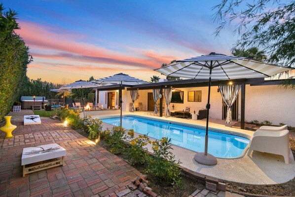 Located in the upscale Desert Estates neighborhood. The Colony Enclave boasts one of the most majestic views of the San Jacinto Peak. The property includes six beach cruisers and biking maps, indoor shuffleboard table, a rotating art gallery on display, a poker table, board games, and a poolside Cornhole set. There is also an 8-person spa, a backyard pool with a cabana-style lounge area, a fire pit, BBQ area and a gourmet kitchen. Unlike most Palm Springs properties, there is no additional fee to heat the pool. Year round pool heat is yours to enjoy free of charge.